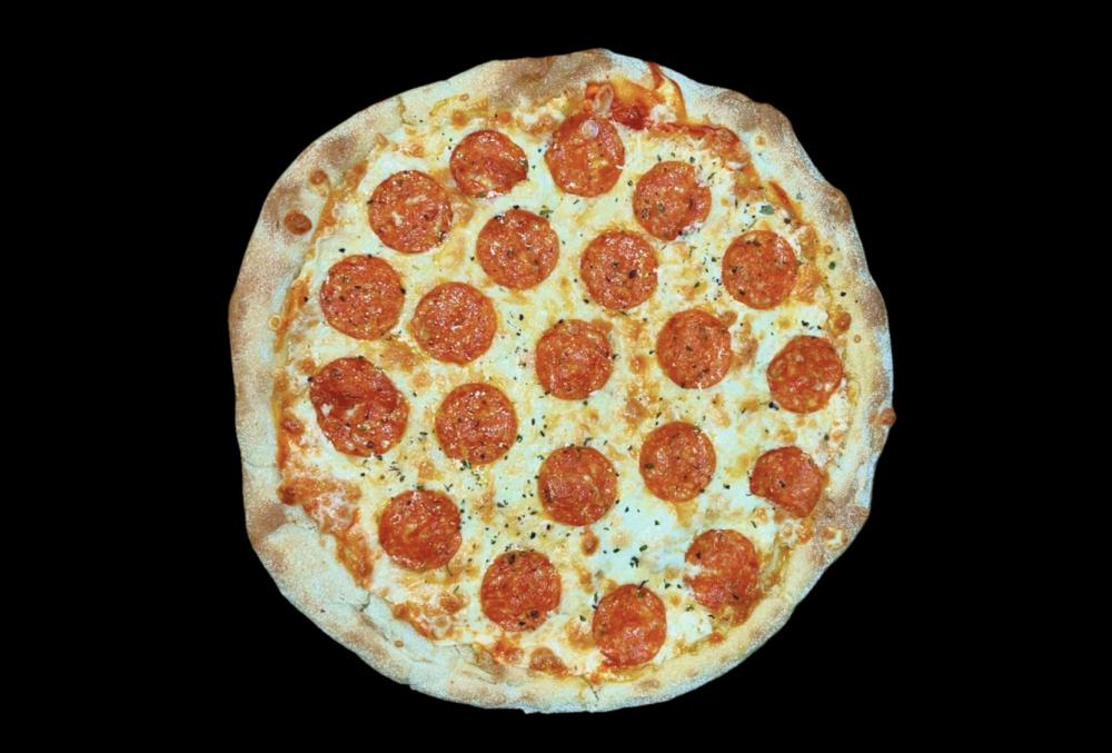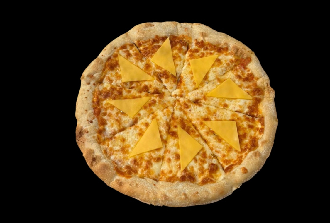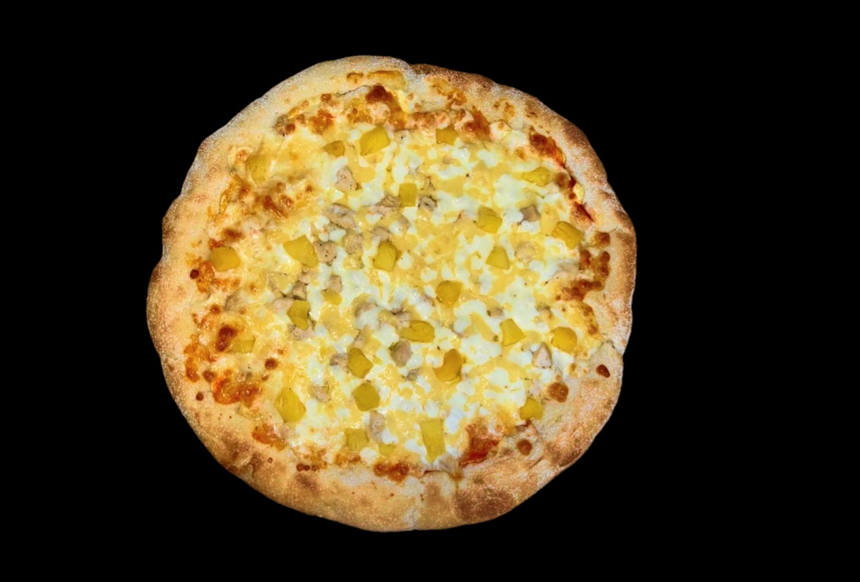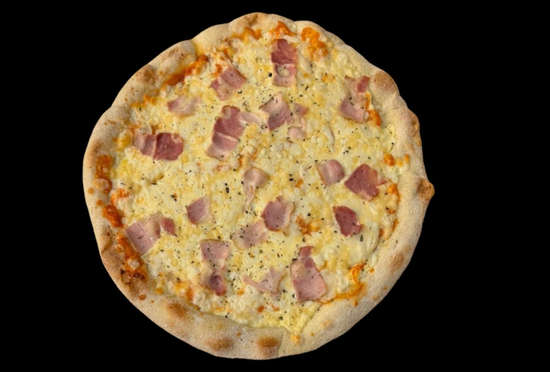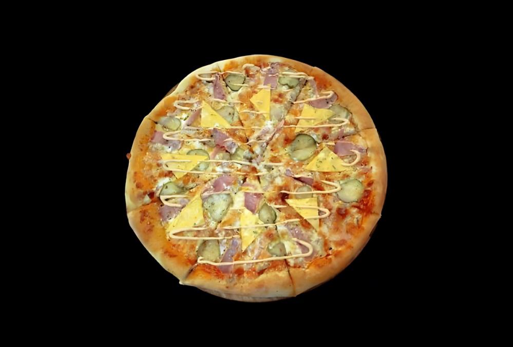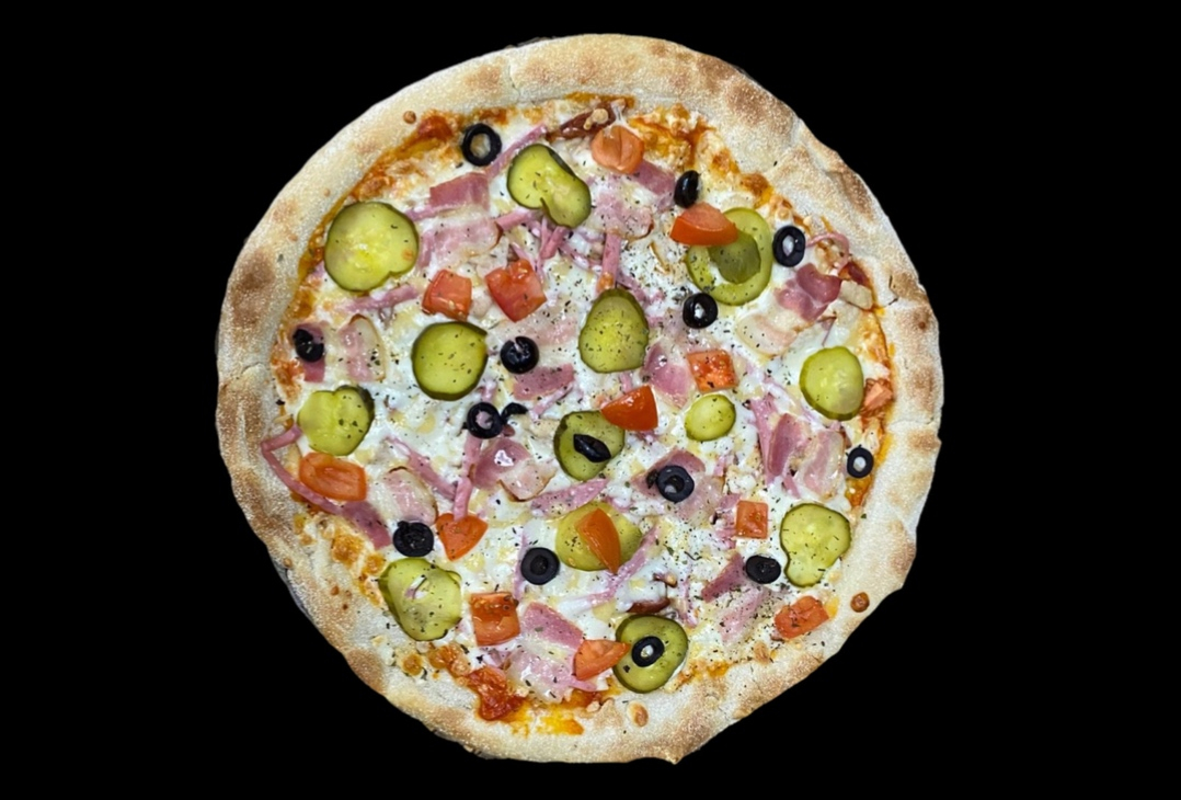 Фирменный соус, сыр моцарелла, сыр Гауда, карбонад, куриное филе, ветчина, бекон, маринованный огурчик, маслины, травы.