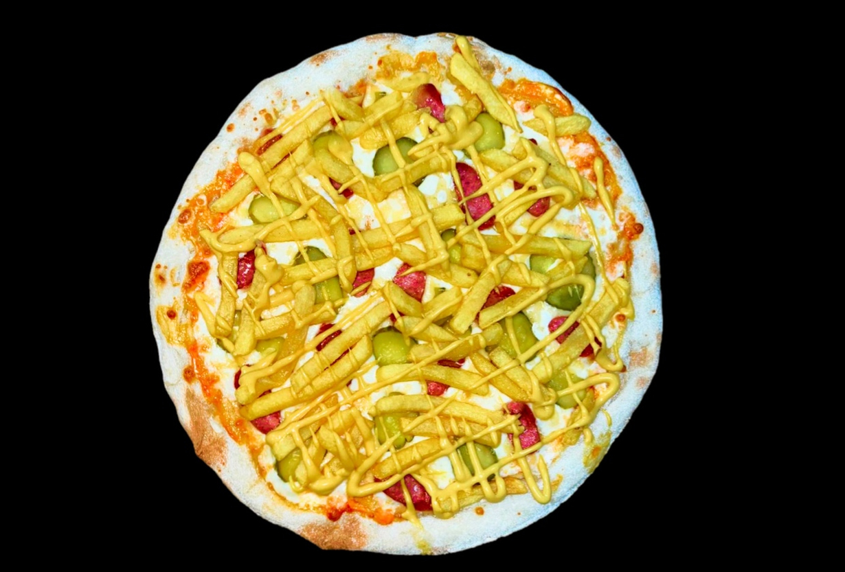 Фирменный соус, сыр моцарелла, сыр Гауда, баварские колбаски, маринованный огурчик, картофель фри, соус горчичный, травы.