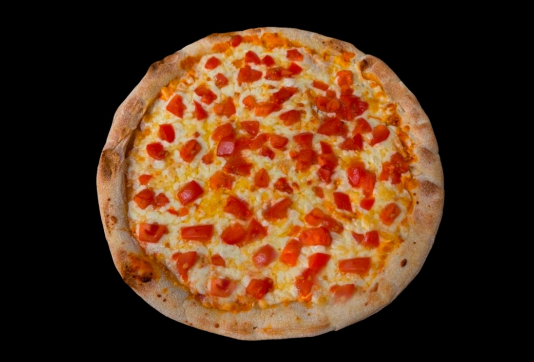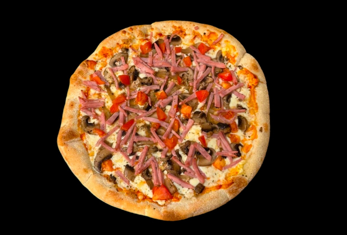 Фирменный соус,сыр моцарелла, сыр Гауда, ветчина, шампиньоны, помидор, травы.