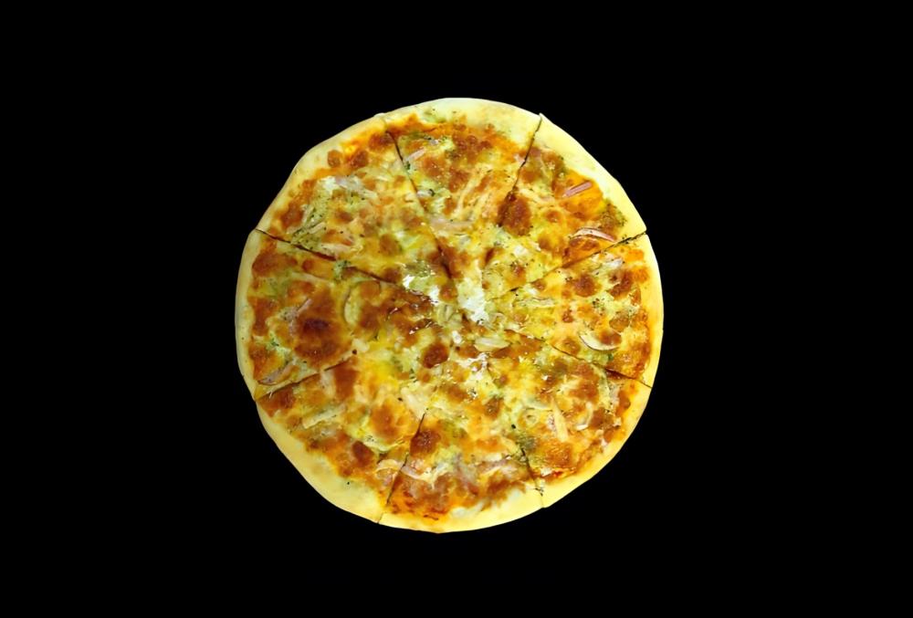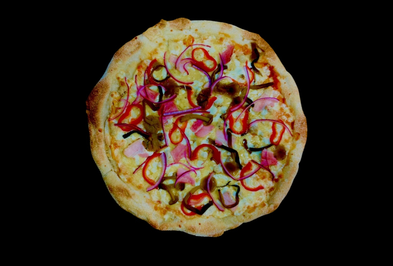 Фирменный соус, сыр моцарелла, сыр Гауда, куриное филе, бекон, болгарский перец, маринованные опята, красный лук, травы.