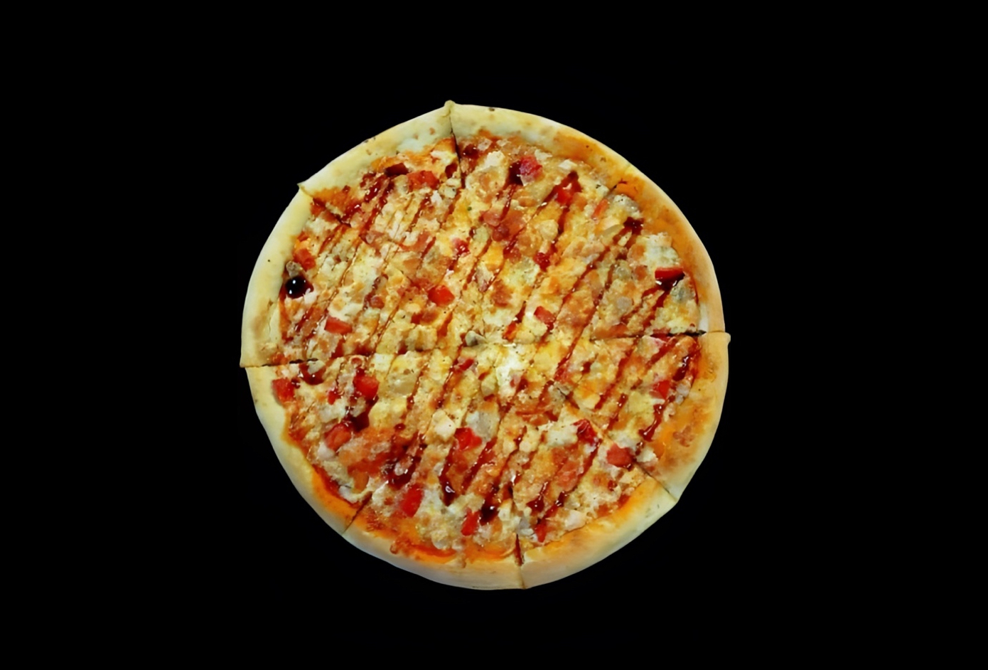 Фирменный соус, сыр моцарелла, сыр Гауда, курица копчёная, курица жаренная, помидор, соус BBQ.