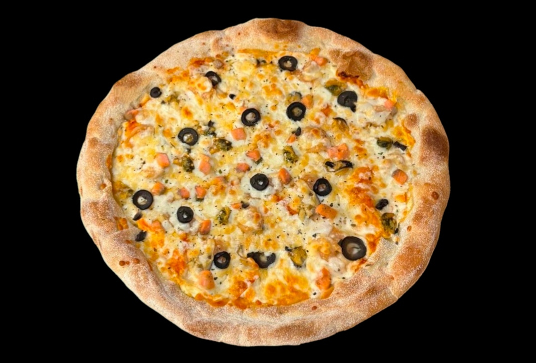 Фирменный соус, сыр моцарелла, сыр Гауда, креветка, лосось, мидии, маслины, травы.