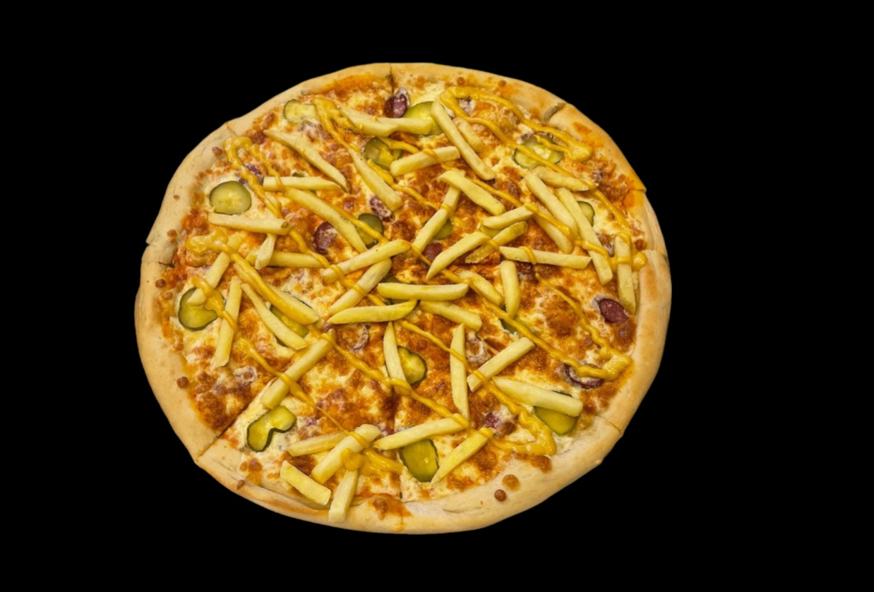 Фирменный соус, сыр моцарелла, сыр Гауда, баварские колбаски, маринованный огурчик, картофель фри, соус горчичный, травы.