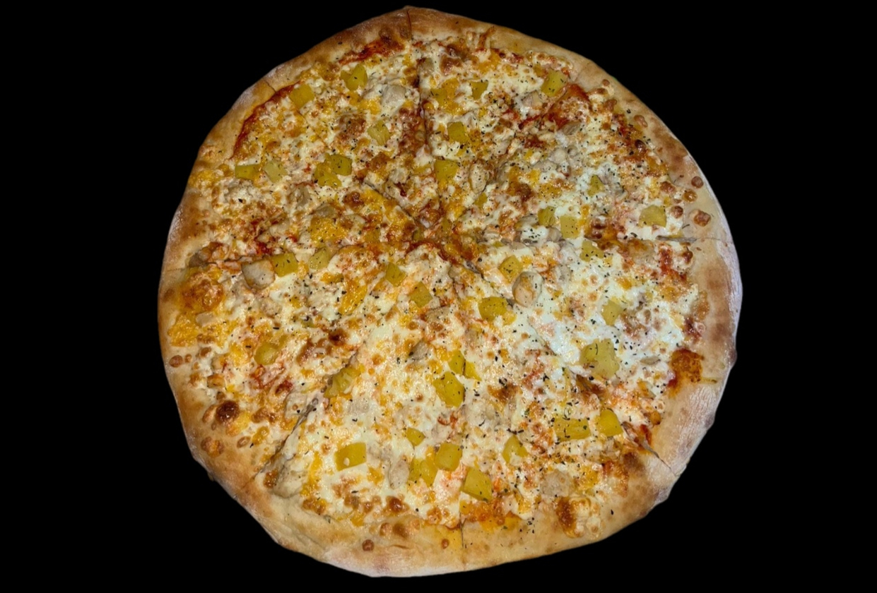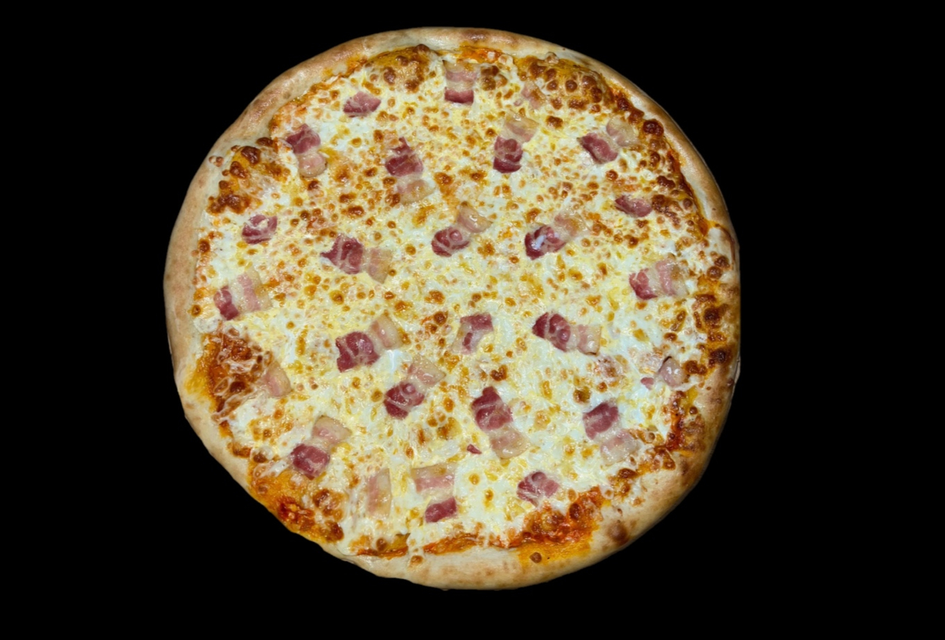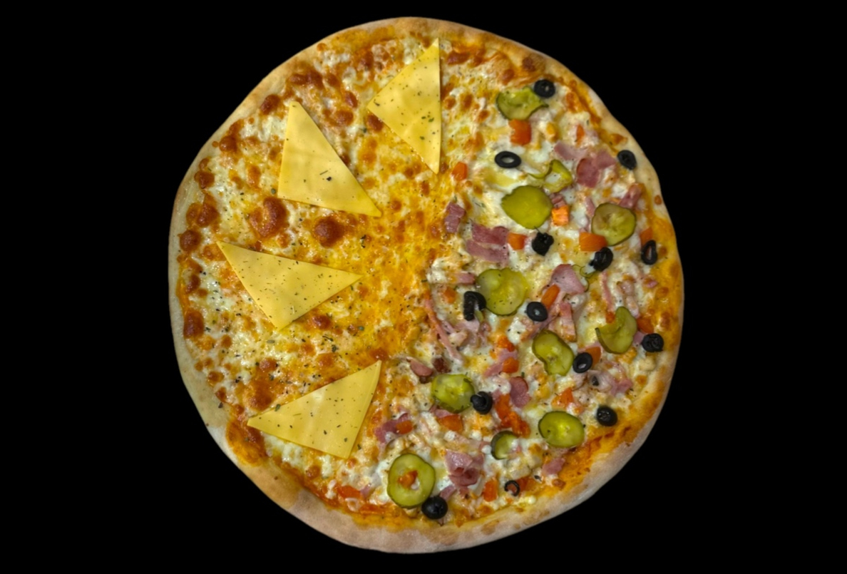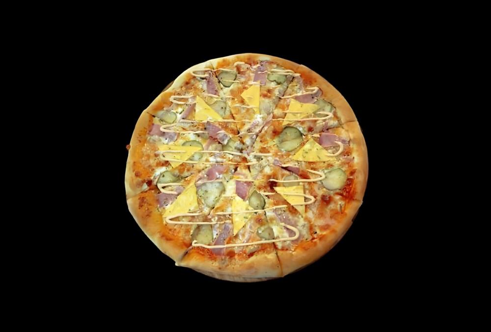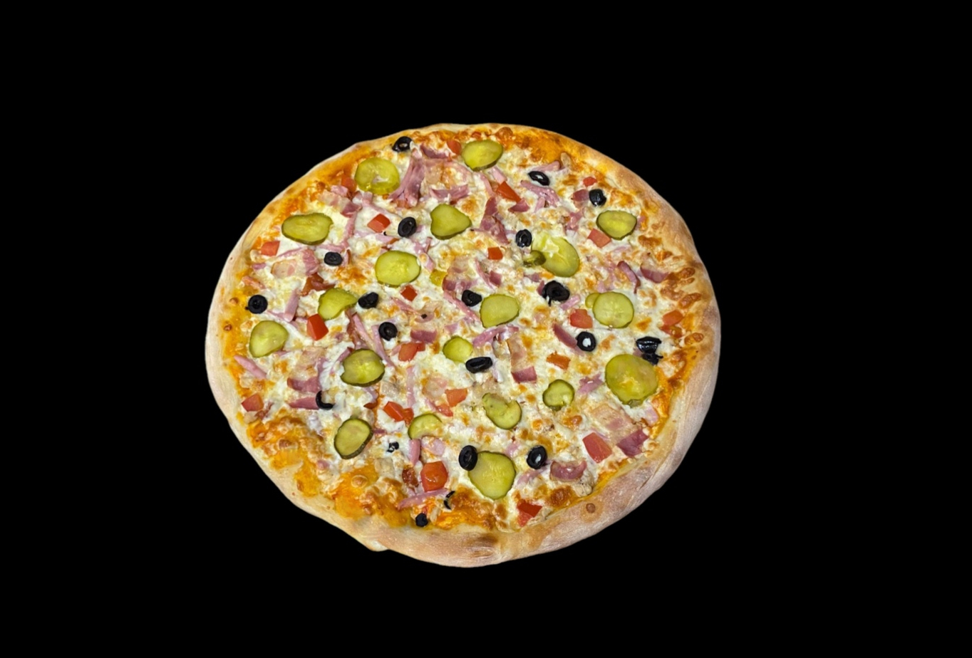 Фирменный соус, сыр моцарелла, сыр гауда, карбонад, куриное филе, ветчина, бекон, маринованный огурчик, маслины, помидор, травы.
