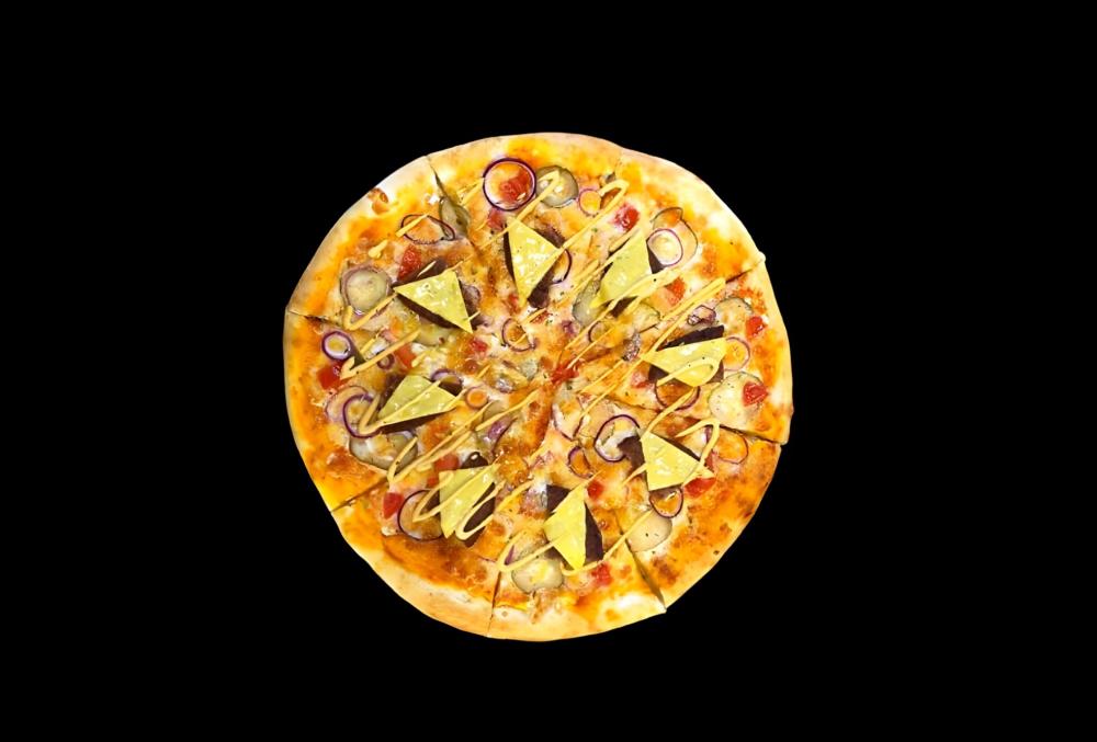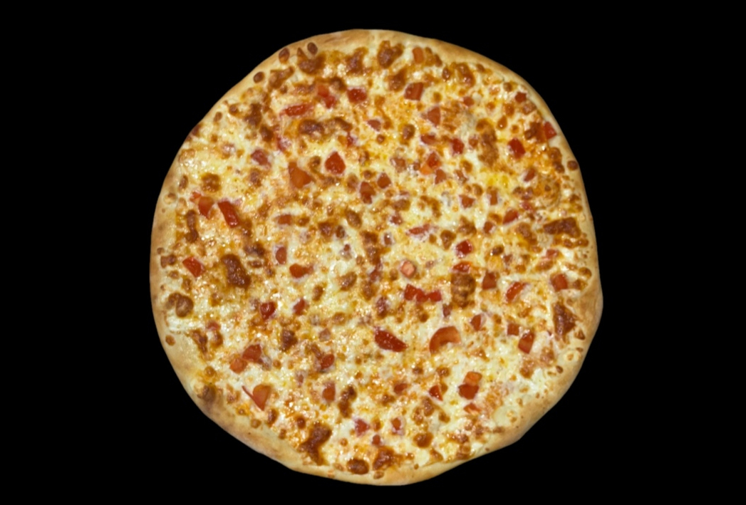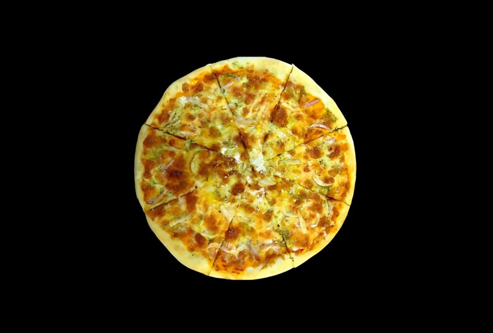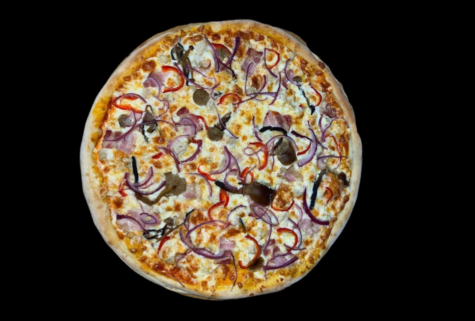 Фирменный соус, сыр моцарелла, сыр гауда, куриное филе, бекон, болгарский перец, маринованные опята, красный лук, травы.