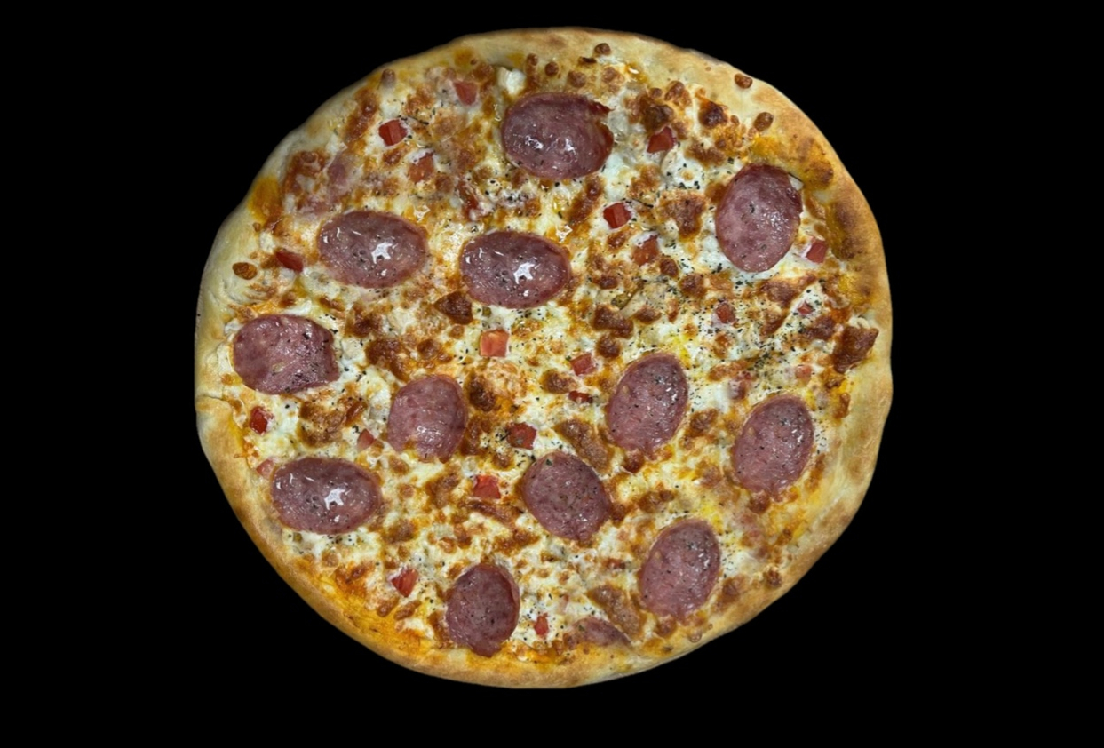 Фирменный соус, сыр моцарелла, сыр гауда, колбаса, сальчичон, куриное филе, травы.