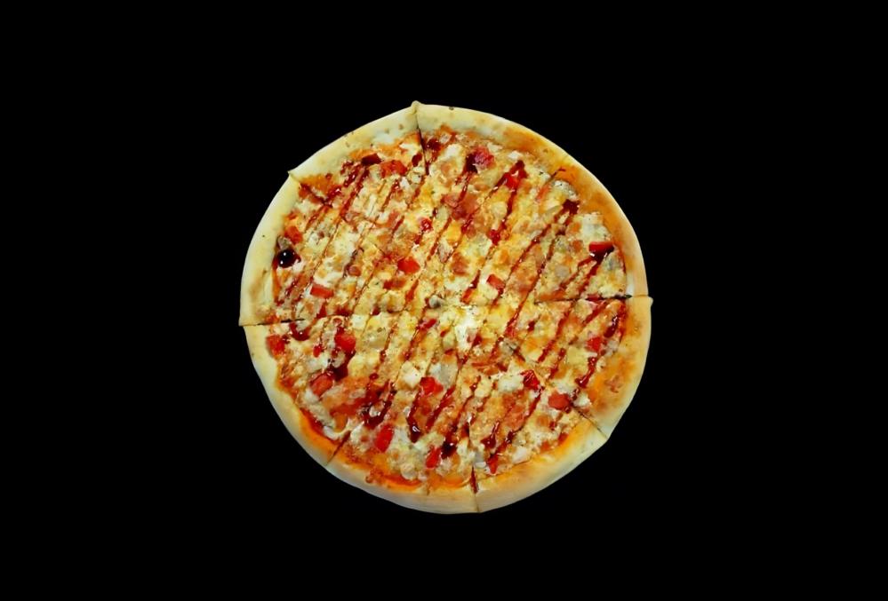 Фирменный соус, сыр моцарелла, сыр Гауда, курица копчёная, курица жаренная, помидор, соус BBQ.