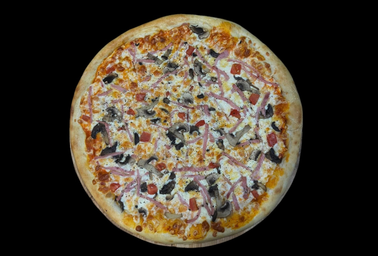 Фирменный соус, сыр моцарелла, сыр Гауда, ветчина, шампиньоны, помидор, травы.