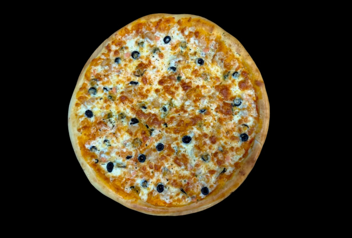 Фирменный соус, сыр моцарелла, сыр Гауда, креветка, мидии, лосось, маслины, травы.