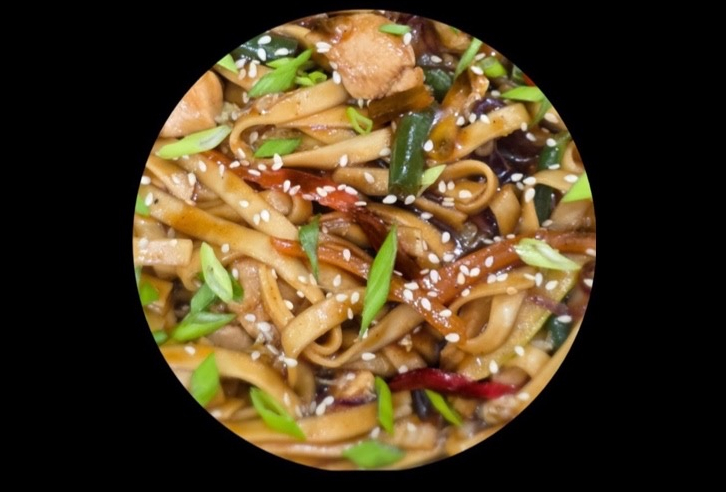Соус Терияки, курица, микс овощей, стручковая фасоль, зеленый лук, кунжут. 450 гр.