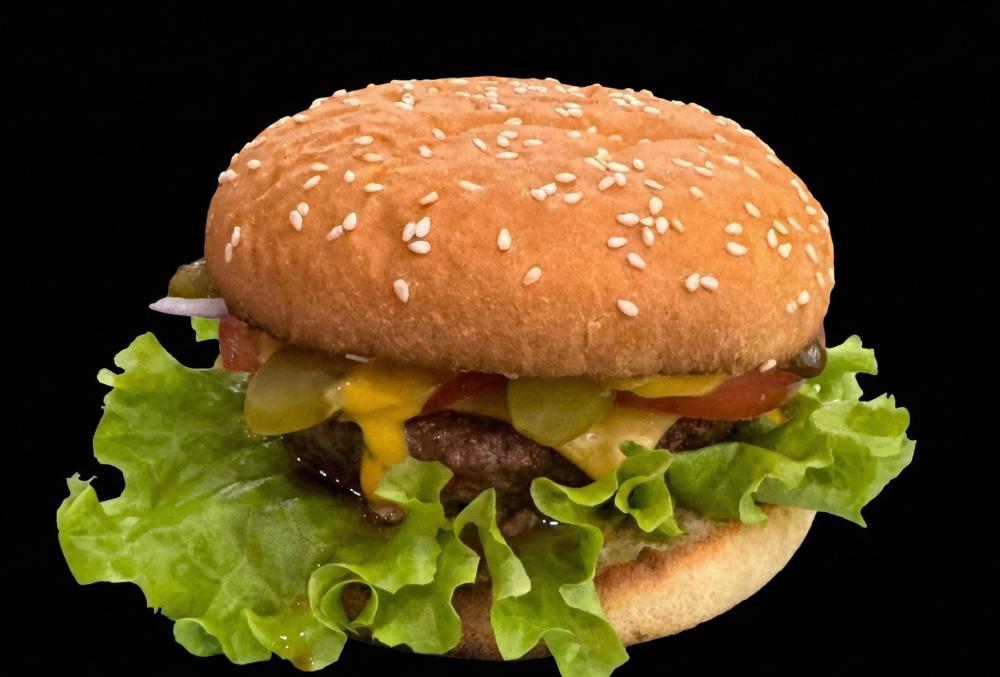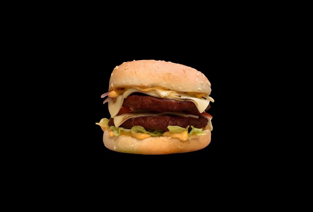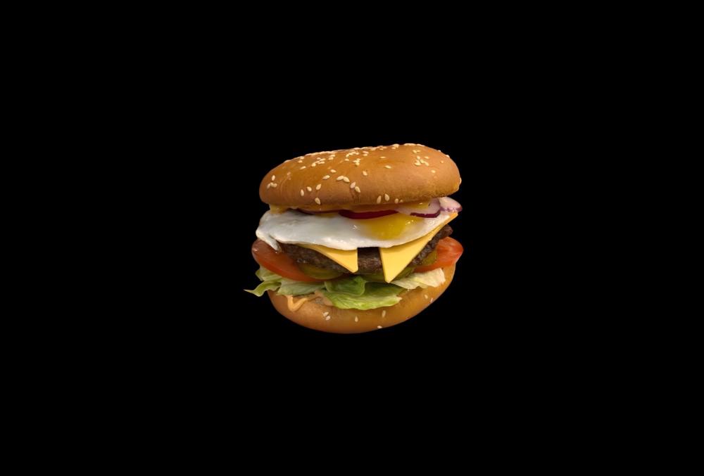 Салат, огурец, помидор, фирменный соус, говяжья котлета, двойной сыр, яйцо, красный лук.